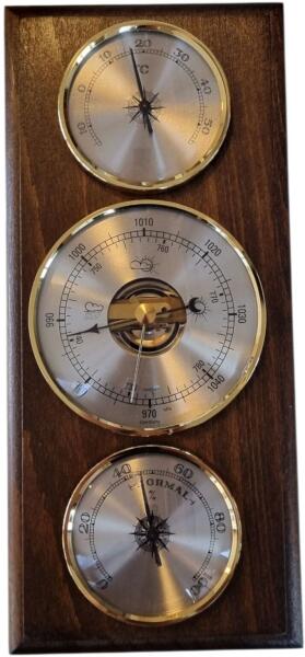 Barométer Kombináció 3042 Dió - Stílusos időjárás-ellenőrzés otthonodban ?️ Ez a 3 az 1-ben barométer kombináció nem csak egy praktikus eszköz, hanem egy elegáns dekoráció is otthonodba. A dió színű hátlap klasszikus megjelenést kölcsönöz, mely bármely szobában jól mutat. Funkciók:Légnyomásmérő: Segít nyomon követni a légnyomás változásait. Hőmérő: Pontos hőmérsékletmérés a szobában. Páratartalom mérő: Ellenőrizd a páratartalmat, hogy mindig ideális legyen a környezeted. Méretek: Teljes méret: 270x120mm Műszerek átmérője: 70mm, 95mmEz a kombinált barométer tökéletes választás, ha szeretnéd otthonodban stílusosan nyomon követni az időjárási viszonyokat. ?