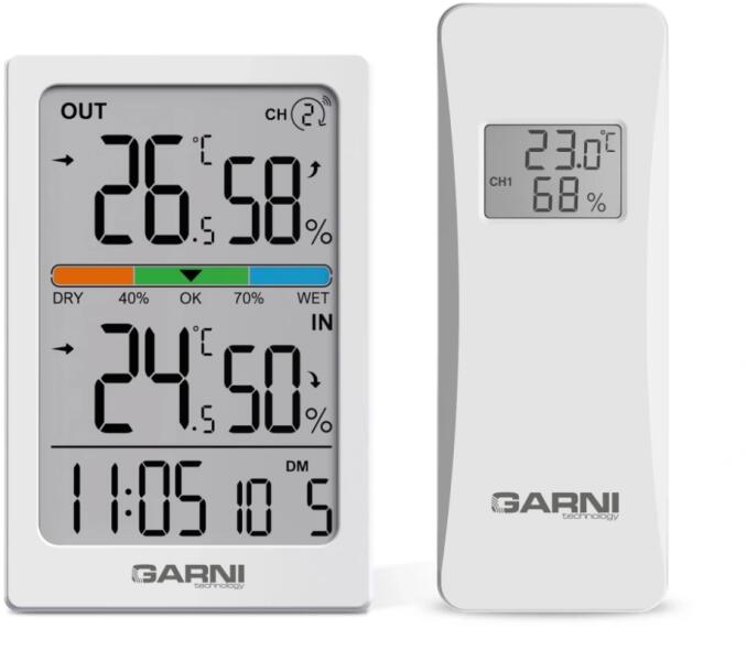 Garni 155TH hőmérséklet és páratartalom mérő komfortfokozat és idő kijelzéssel.