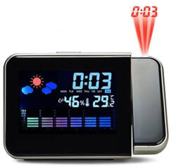 Projektoros óra és időjárás állomásHa nem szereted az éjjeliszekrényeden vagy polcodon keresgélni a pontos időt, akkor ezt az órát Neked találták ki!Jól látható színes kijelzővel és projektorral szerelték fel, így az időt a falra, mennyezetre vetíti akár egész éjjel!Projektorja 180°-ban elforgatható, bárhova irányíthatod és fókuszát is szabályozhatod. 4,5V-os hálózati adapterről működtetve (nem tartozék) a kivetítő folyton világít. Elemmel a kivetítő funkció és a háttérvilágítás gombnyomásra kapcsolódik be, pár másodperc után pedig kikapcsol. A készüléket számos más funkcióval is felszerelték, nem lesz szükséged többé belső hőmérőre és naptárra sem, de leolvashatod róla a páratartalmat és a várható időjárást is. Nagy kijelzőn az időjárást, a dátumot, és hőmérsékletet is mutatja. Az időt ki tudja vetíteni a falra, egy elforgatható lézer segítségével. 2db AAA elemről (nem tartozék) és-vagy adapterről működik (nem tartozék!). Adapterről a kivetítő folyamatos, elemről csak gombnyomásra. Ébresztő, dátum, és hőmérséklet funkció a nagyméretű színes kijelzőn.